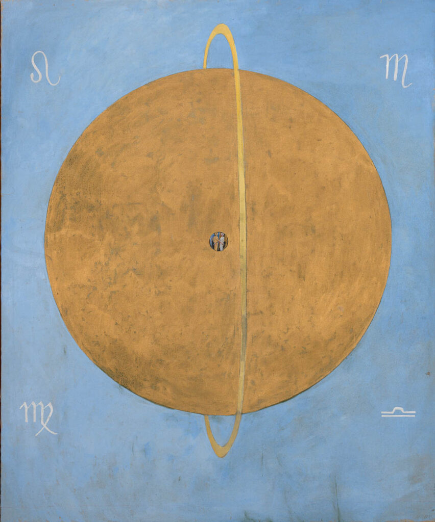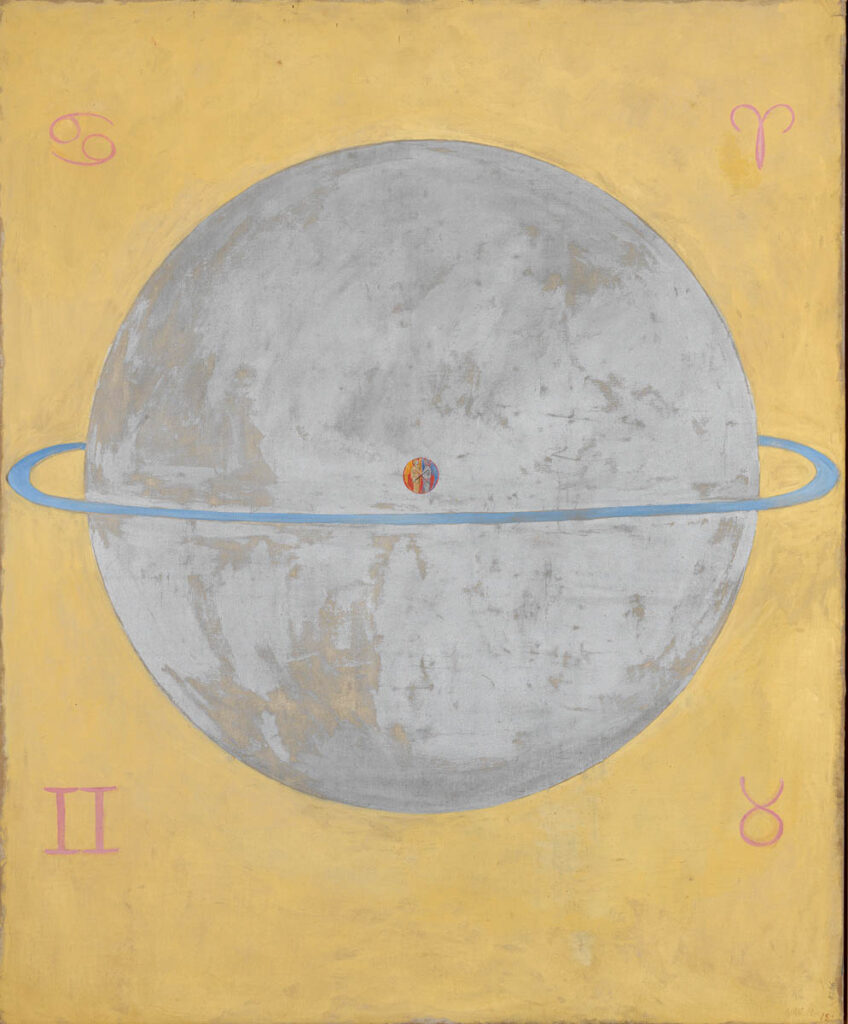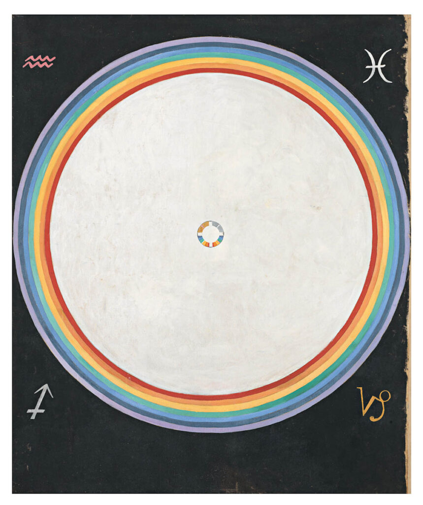 Cirkel och kvadrat, himmel och jord, samt kors – tre universella symboler, tre arketypiska symboler utbredda överallt på jorden. Hilma ger tiden och evigheten gestalt genom människans symboler. När de två första tavlorna ovan sätts samman bildas en klassisk kristen symbol – ringkorset. Det har visats hur Hilma velat gestalta tidens gång fram till nollåret genom den kvadrat som stjärntecknen bildar runt cirkeln/jorden i tavlorna. I den sista tavlan framträder ringkorset i bildens mitt omgärdat av regnbågens symbolik. Vi är här framme i år noll räknat från Adams födelse – men finns nu en fortsättning  på Hilmas hemligheter i den kristna tideräkningen?