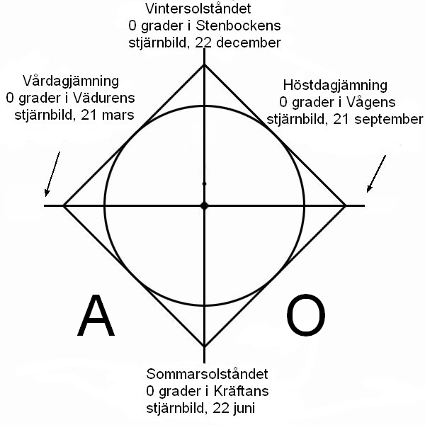 • Vi söker ringkorset med utgångspunkt i det astronomiska nollårets början i stjärntecknen Väduren/Vågen respektive Kräftan/Stenbockens nollpunkter. Införandet av den nya romerska tideräkningen blev knuten till vintersolståndet.